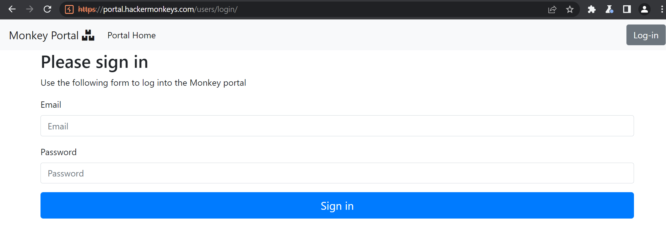 portal.hackermonkeys.com seems to be the ‘monkey authentication site’ mentioned in the challenge description, and just has a simple login field.