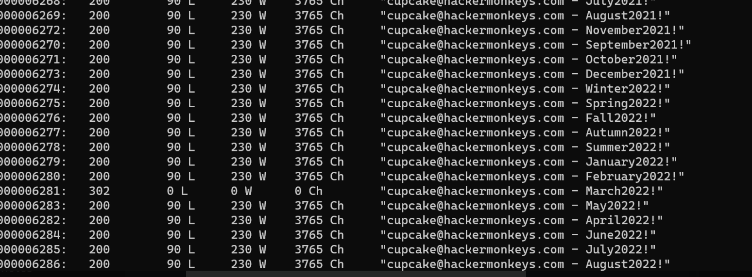 Only one of the credential pairs resulted in a 302 response (redirect) instead of a 200: cupcake@hackermonkeys.com:March2022!