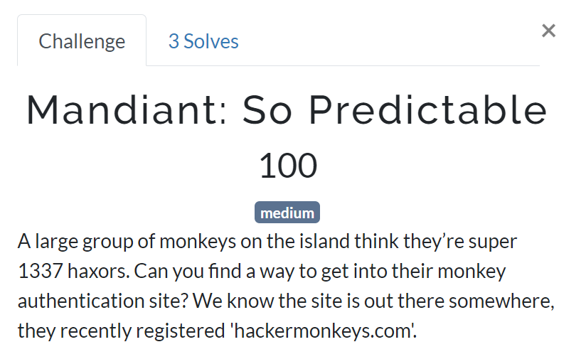 A large group of monkeys on the island think they’re super 1337 haxors. Can you find a way to get into their monkey authentication site? We know the site is out there somewhere, they recently registered ‘hackermonkeys.com’.
