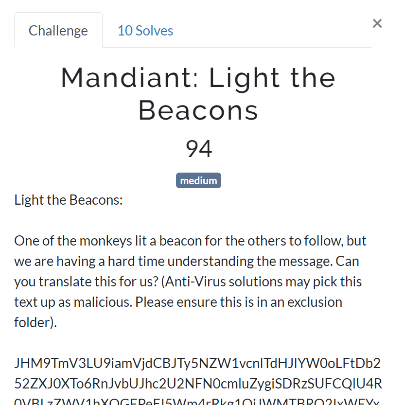 One of the monkeys lit a beacon for the others to follow, but we are having a hard time understanding the message. Can you translate this for us? (Anti-Virus solutions may pick this text up as malicious. Please ensure this is in an exclusion folder).