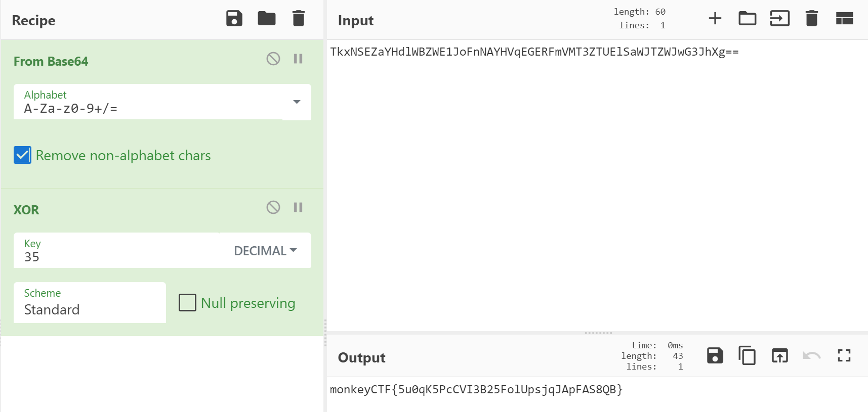 Moving on, if you try to decode this base64 straight up, you won't get far. It's also run through a for loop where it gets XORd with a key of 35