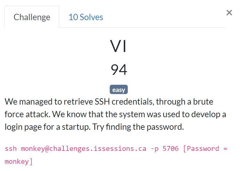 ssh monkey@challenges.issessions.ca -p 5706 [Password = monkey]