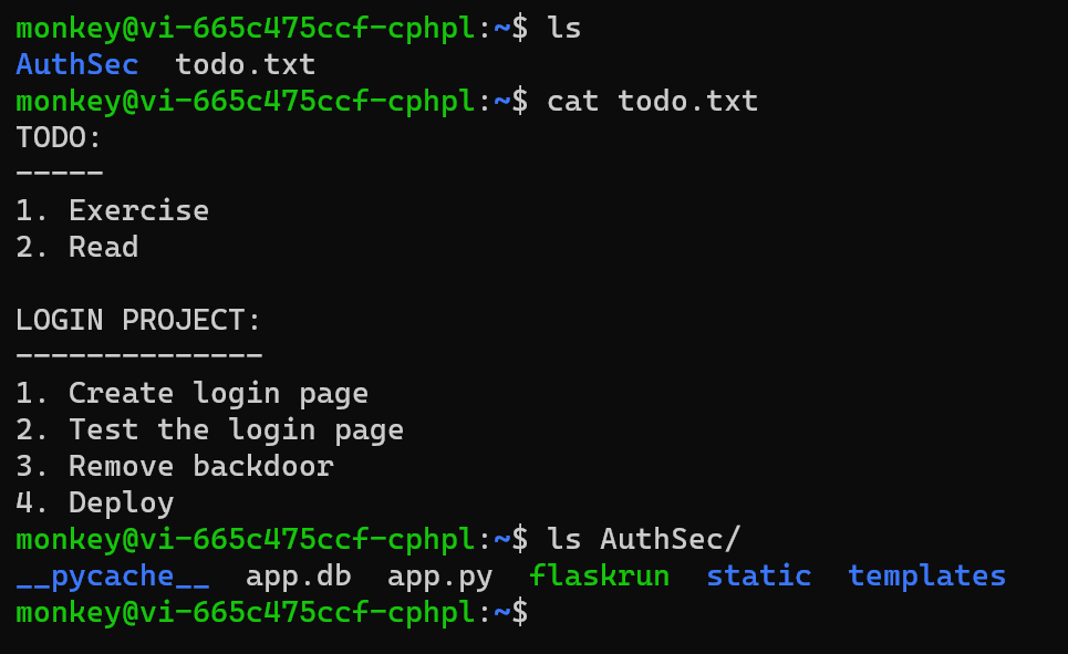 The second part was true, but it wasn't a large part of the challenge. Exploring the file system a bit shows that we're a developer who is creating a flask app, and that there may be a backdoor.