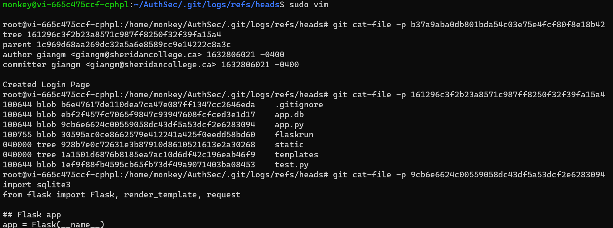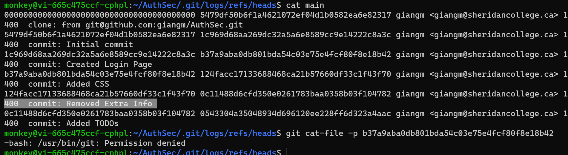 we can see past commits. One of them mentions “Removed Extra Info”. When trying to use git cat-file -p