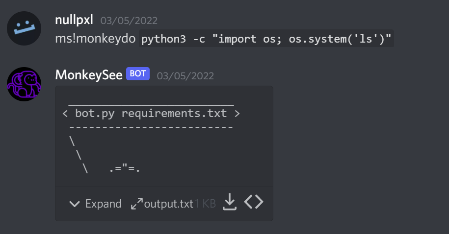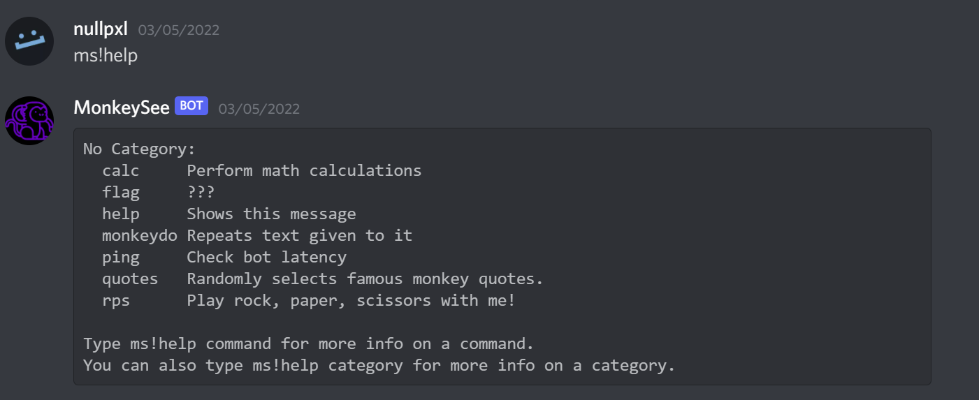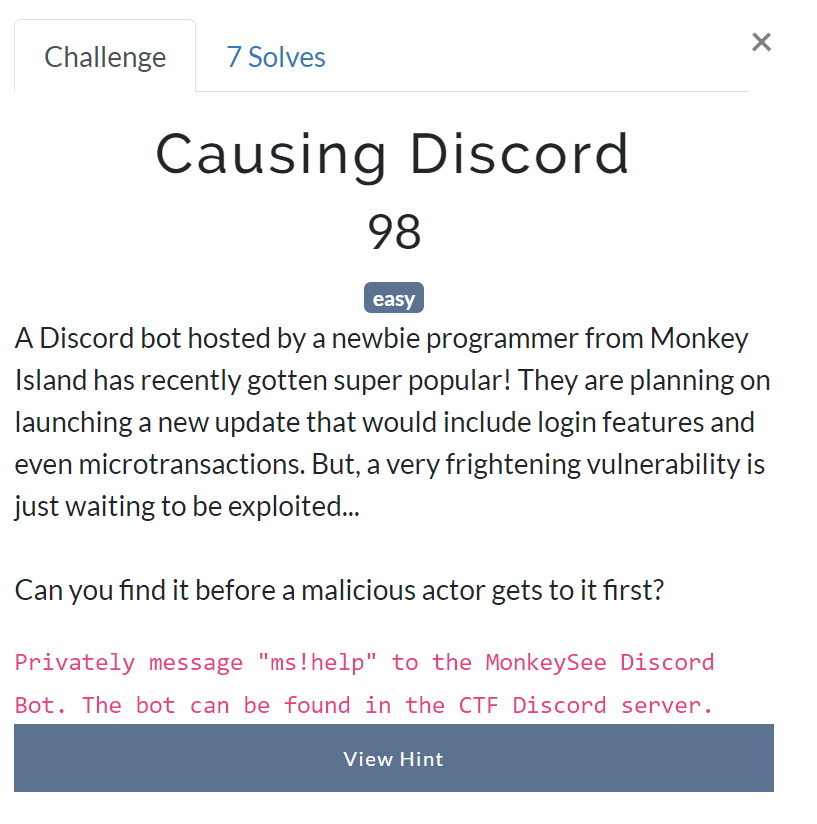 Can you find it before a malicious actor gets to it first?Privately message "ms!help" to the MonkeySee Discord Bot. The bot can be found in the CTF Discord server.