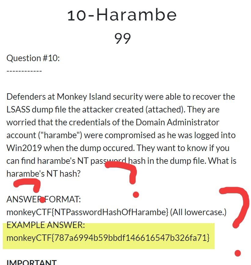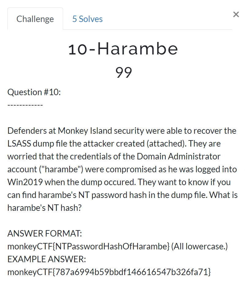 ANSWER FORMAT: monkeyCTF{NTPasswordHashOfHarambe} (All lowercase.)