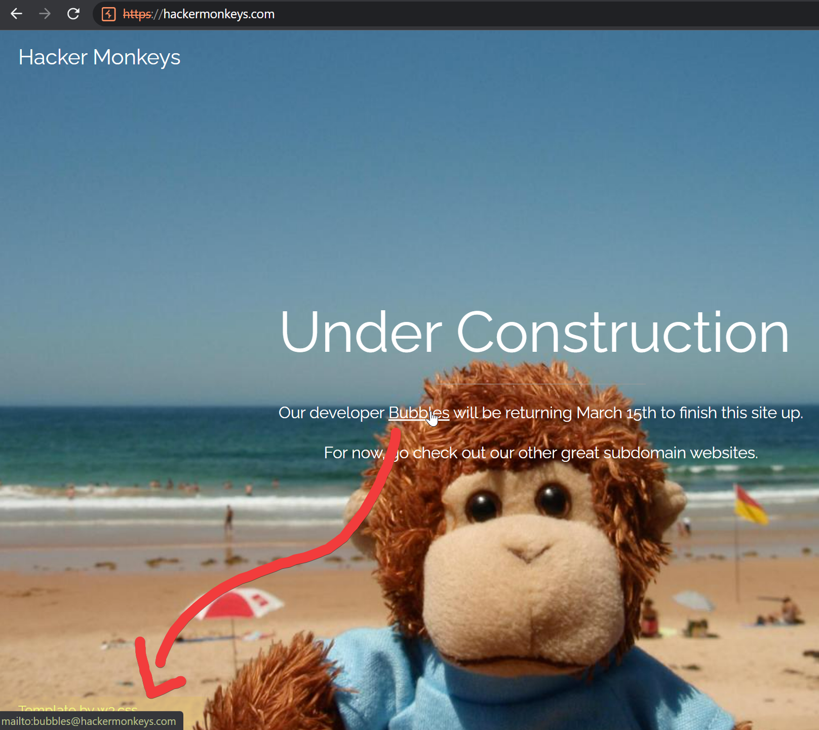 This isn't super useful yet, but the challenge description also mentions “the site is out there somewhere” and that they “recently registered ‘hackermonkeys.com’ “. So it's probably a subdomain of hackermonkeys.com.